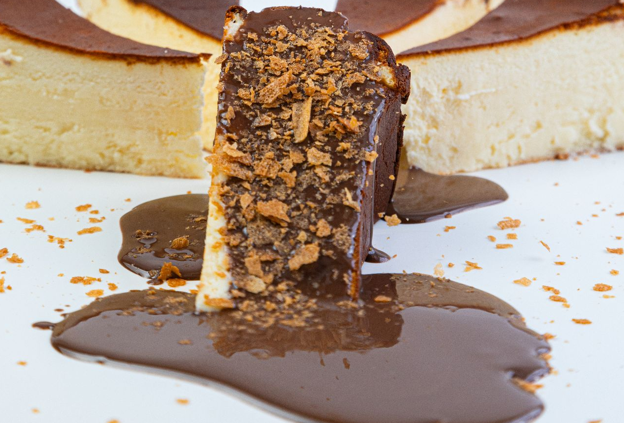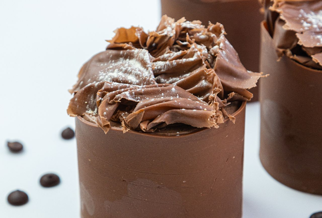 Оформленный шоколадным ободком и лепестками.